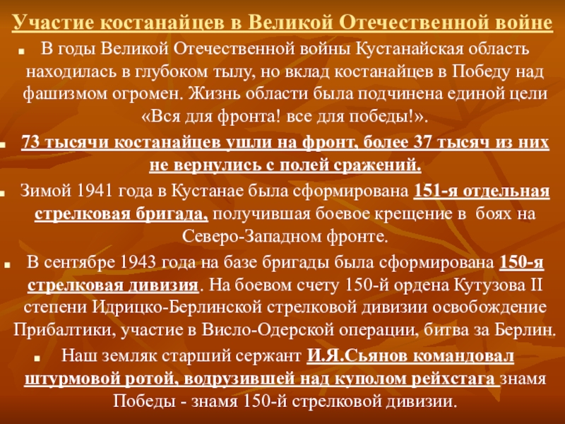Слайд 87Участие костанайцев в Великой Отечественной войне