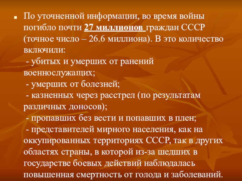 Слайд 89По уточненной информации, во время войны погибло почти 27 миллионов граждан