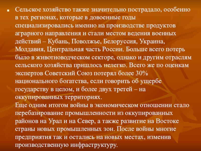 довоенные годы специализировались именно на производстве продуктов аграрного направления и стали местом ведения военных действий – Кубань, Поволжье, Белоруссия, Украина, Молдавия, Центральная часть России. Больше всего потерь было в животноводческом секторе, однако и другим отраслям сельского хозяйства пришлось нелегко. Всего же по оценкам экспертов Советский Союз потерял более 30% национального богатства, если говорить об ущербе государству в целом, и более двух третей – на оккупированных территориях.