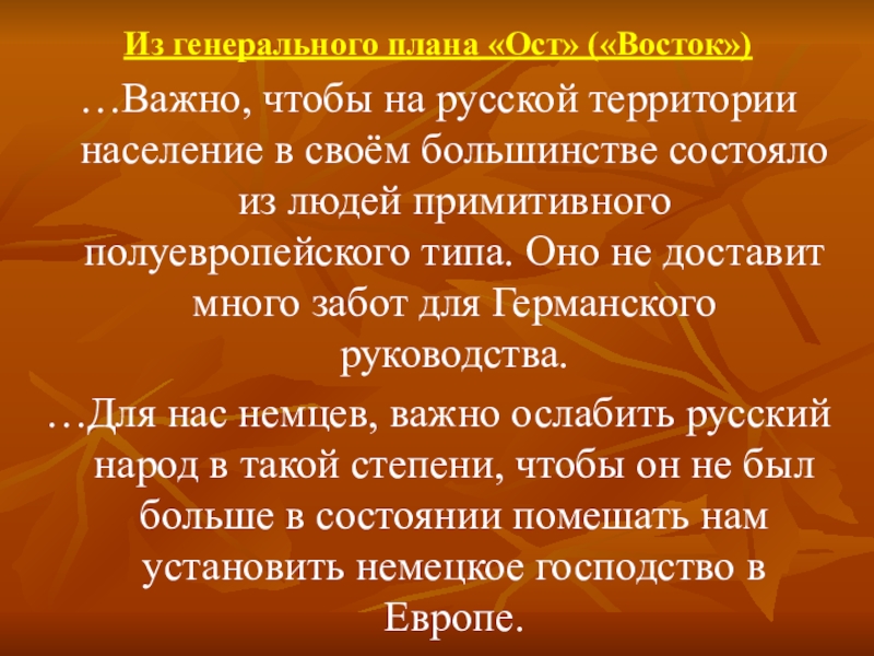 …Для нас немцев, важно ослабить русский народ в такой степени, чтобы он не был больше в состоянии помешать нам установить немецкое господство в Европе.