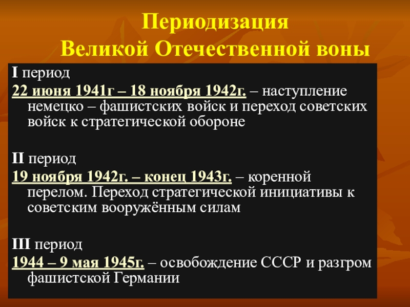 1944 – 9 мая 1945г. – освобождение СССР и разгром фашистской Германии