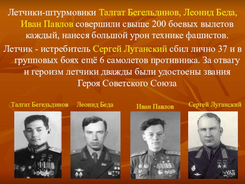 Слайд 83Летчики-штурмовики Талгат Бегельдинов, Леонид Беда, Иван Павлов совершили свыше 200 боевых