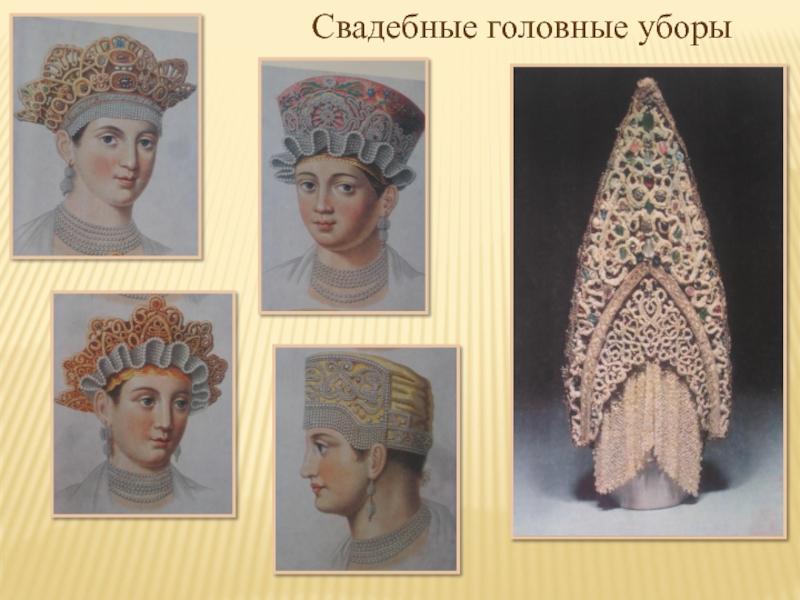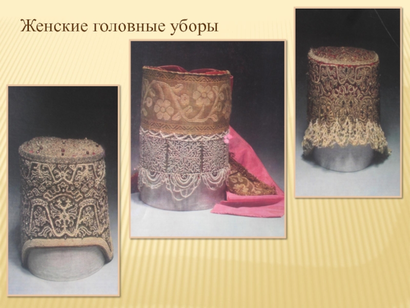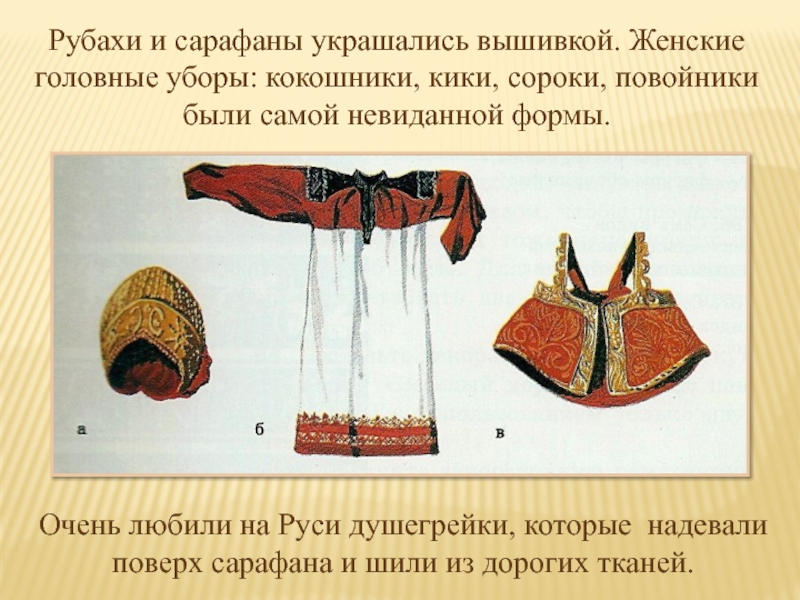 Слайд 15Рубахи и сарафаны украшались вышивкой. Женские головные уборы: кокошники, кики, сороки,