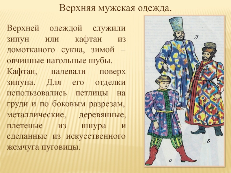 Кафтан, надевали поверх зипуна. Для его отделки использовались петлицы на груди и по боковым разрезам, металлические, деревянные, плетеные из шнура и сделанные из искусственного жемчуга пуговицы.