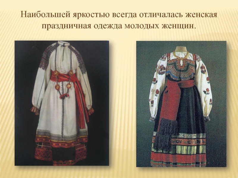 Слайд 5Наибольшей яркостью всегда отличалась женская праздничная одежда молодых женщин.