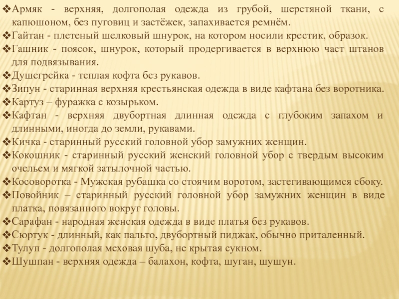 Слайд 35Армяк - верхняя, долгополая одежда из грубой, шерстяной ткани, с капюшоном,