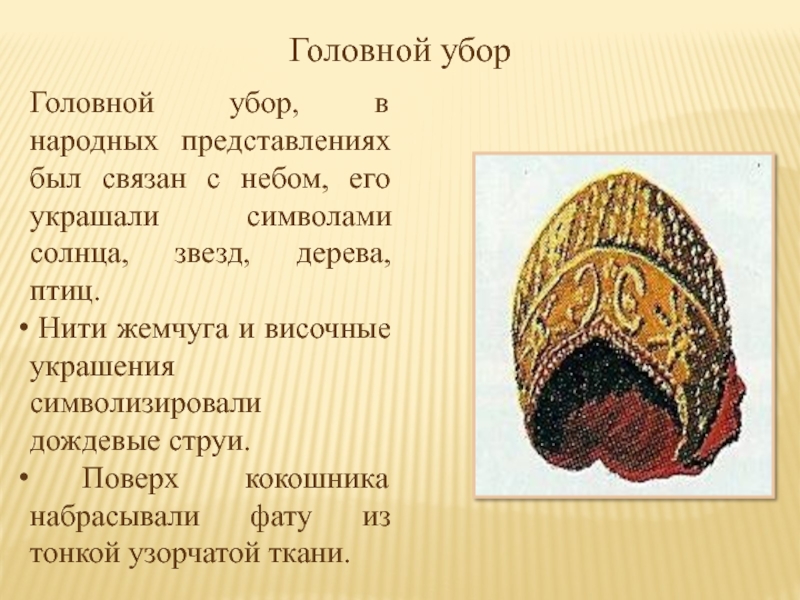 Кокошник - старинный русский женский головной убор с твердым высоким очельем и мягкой затылочной частью.