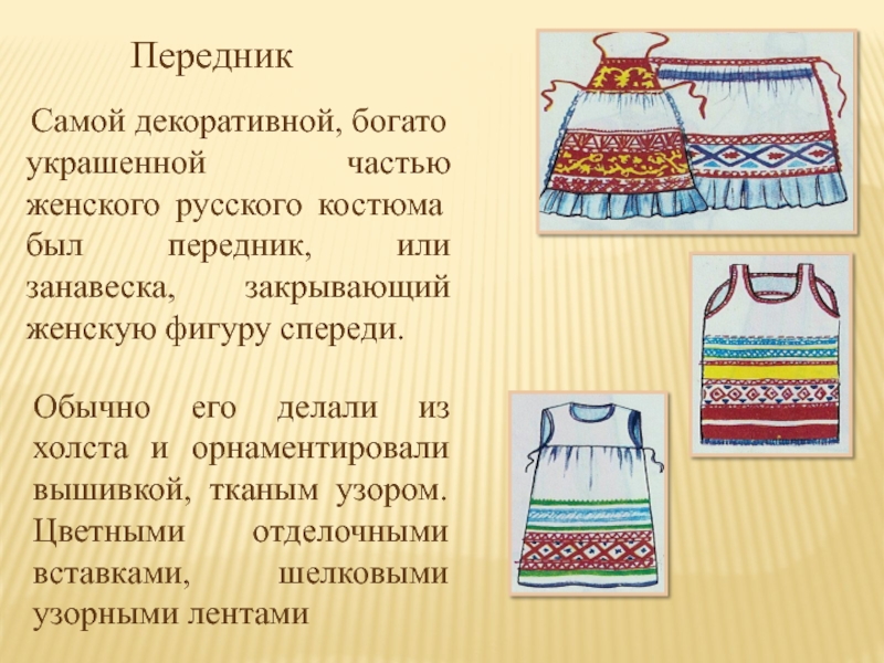 Самой декоративной, богато украшенной частью женского русского костюма был передник,