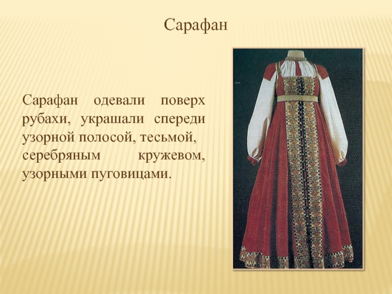 Сарафан одевали поверх рубахи, украшали спереди узорной полосой, тесьмой,