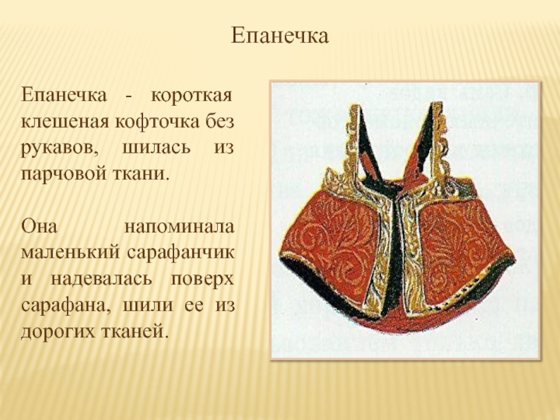 Епанечка - короткая клешеная кофточка без рукавов, шилась из парчовой ткани.
