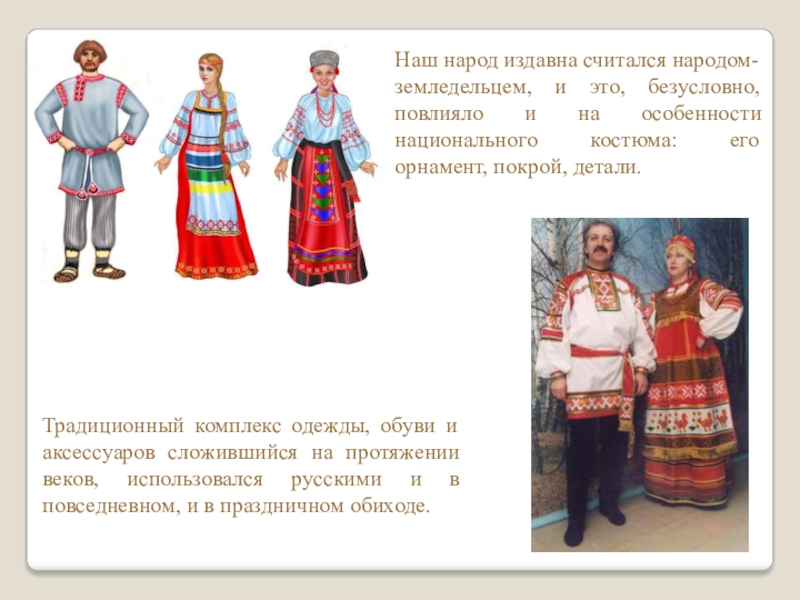 Наш народ издавна считался народом-земледельцем, и это, безусловно, повлияло и на особенности национального костюма: его орнамент, покрой, детали.