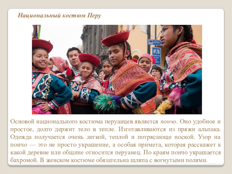 Слайд 23Основой национального костюма перуанцев является пончо. Оно удобное и простое, долго