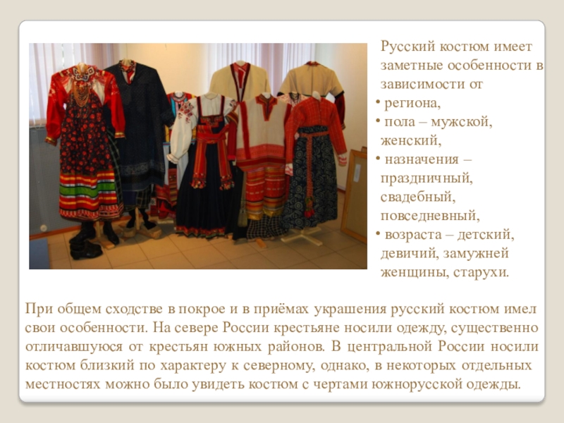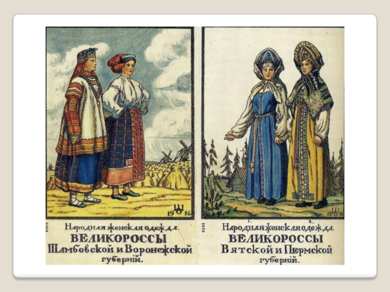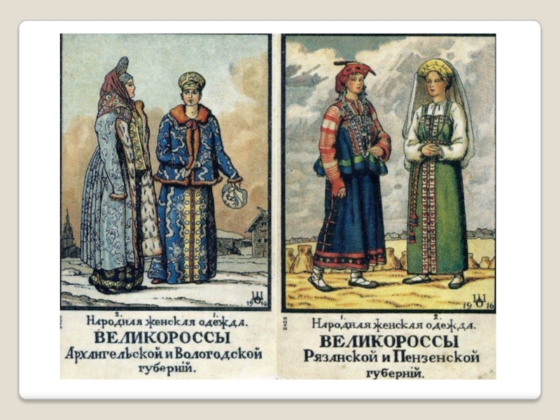 Слайд 30Русский костюм имеет заметные особенности в зависимости от