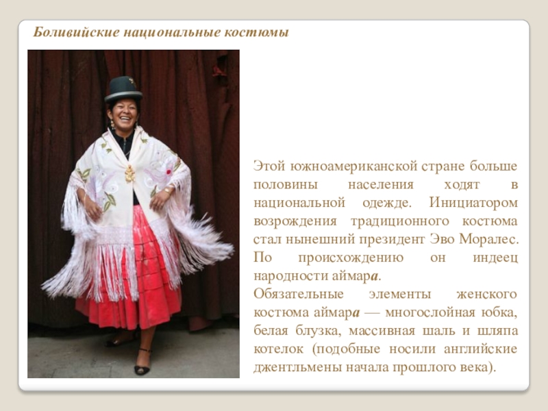 возрождения традиционного костюма стал нынешний президент Эво Моралес. По происхождению он индеец народности аймара.