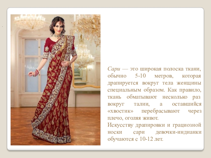 Слайд 19Сари — это широкая полоска ткани, обычно 5-10 метров, которая драпируется
