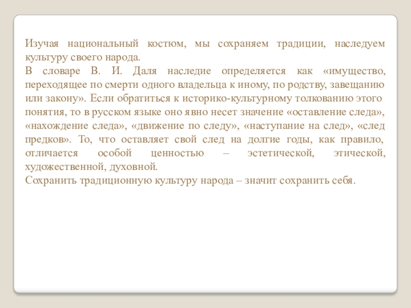 В. И. Даля наследие определяется как «имущество, переходящее по смерти одного владельца к иному, по родству, завещанию или закону». Если обратиться к историко-культурному толкованию этого понятия, то в русском языке оно явно несет значение «оставление следа», «нахождение следа», «движение по следу», «наступание на след», «след предков». То, что оставляет свой след на долгие годы, как правило, отличается особой ценностью – эстетической, этической, художественной, духовной.