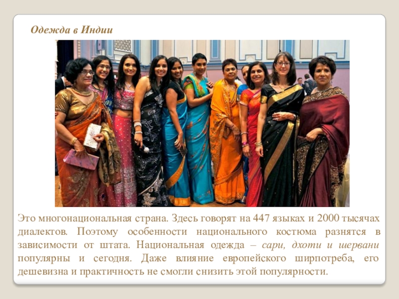 диалектов. Поэтому особенности национального костюма разнятся в зависимости от штата. Национальная одежда – сари, дхоти и шервани популярны и сегодня. Даже влияние европейского ширпотреба, его дешевизна и практичность не смогли снизить этой популярности.