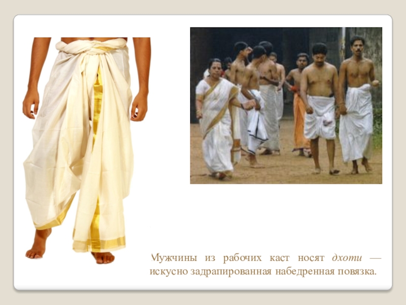 Слайд 21Мужчины из рабочих каст носят дхоти — искусно задрапированная набедренная повязка.