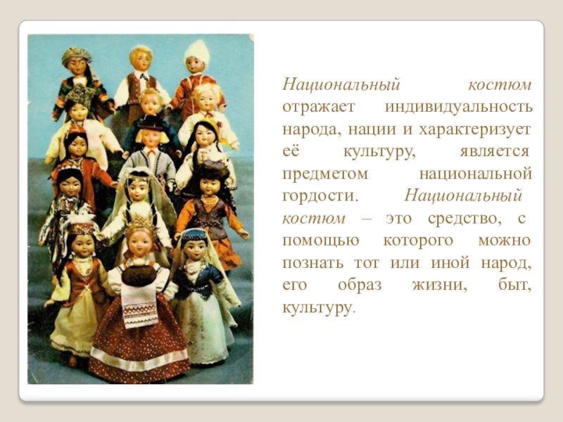 Слайд 4Национальный костюм отражает индивидуальность народа, нации и характеризует её культуру, является