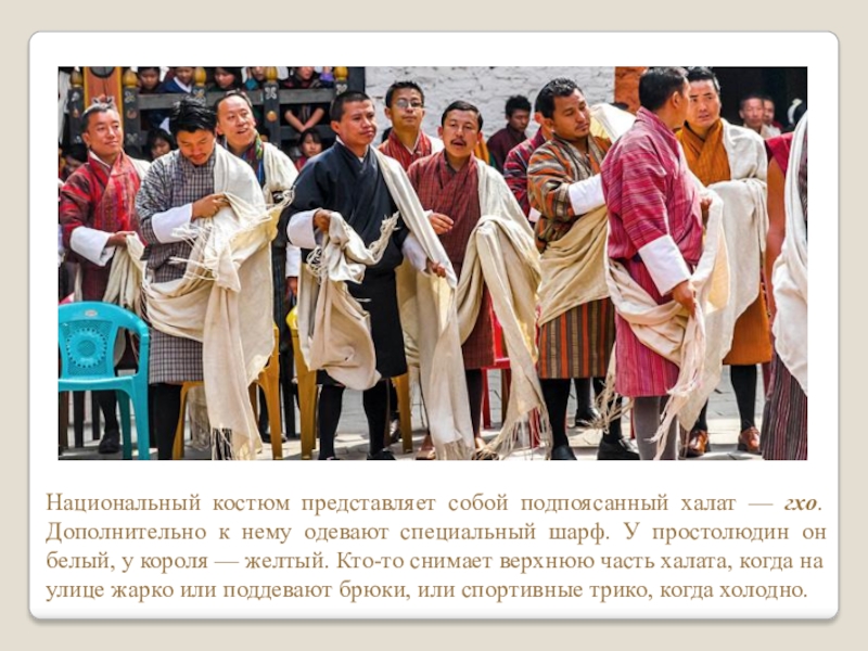 Слайд 17Национальный костюм представляет собой подпоясанный халат — гхо. Дополнительно к нему