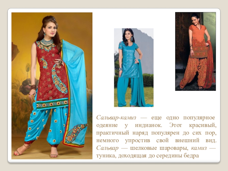 Слайд 20Сальвар-камиз — еще одно популярное одеяние у индианок. Этот красивый, практичный