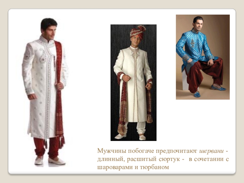 Слайд 22Мужчины побогаче предпочитают шервани - длинный, расшитый сюртук - в сочетании