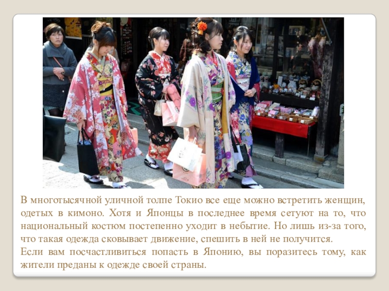 Слайд 13В многотысячной уличной толпе Токио все еще можно встретить женщин, одетых