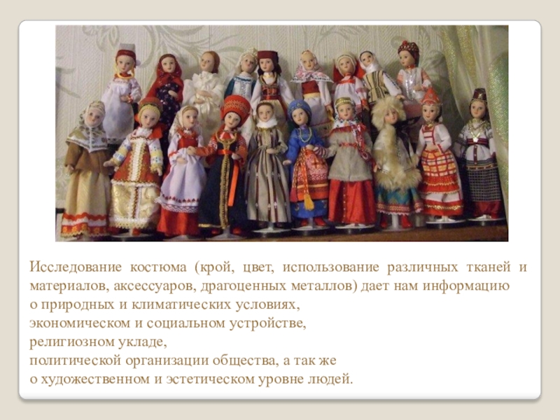 Слайд 6Исследование костюма (крой, цвет, использование различных тканей и материалов, аксессуаров, драгоценных