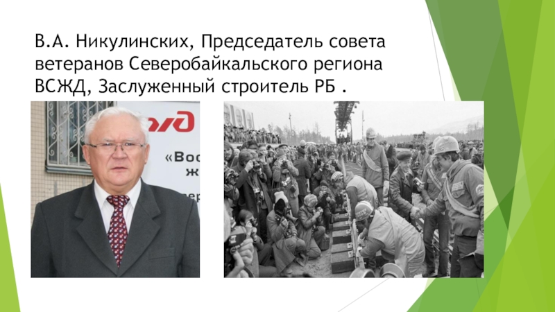Слайд 10В.А. Никулинских, Председатель совета ветеранов Северобайкальского региона ВСЖД, Заслуженный строитель РБ