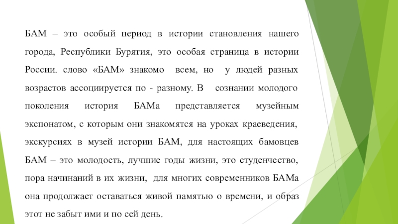 Бурятия, это особая страница в истории России. слово «БАМ» знакомо всем, но у людей разных возрастов ассоциируется по - разному. В сознании молодого поколения история БАМа представляется музейным экспонатом, с которым они знакомятся на уроках краеведения, экскурсиях в музей истории БАМ, для настоящих бамовцев БАМ – это молодость, лучшие годы жизни, это студенчество, пора начинаний в их жизни, для многих современников БАМа она продолжает оставаться живой памятью о времени, и образ этот не забыт ими и по сей день.