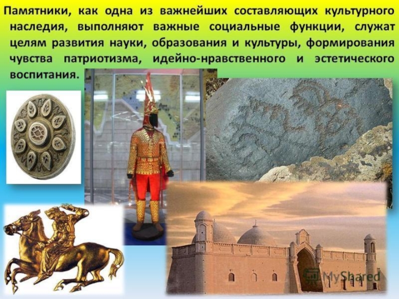 Культурное наследие Казахстана вобрало в себя все многообразие культурных ценностей народов, проживающих на ее территории. Это свыше
