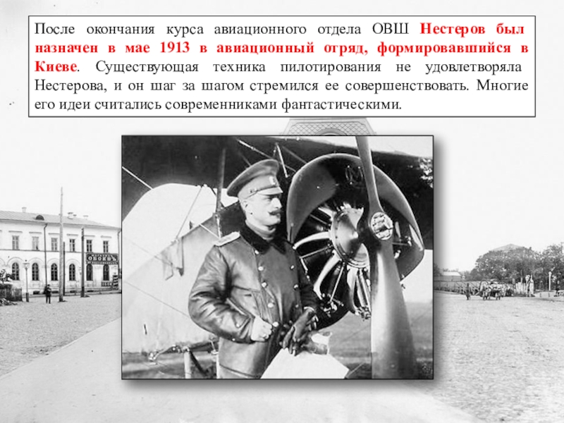 1913 в авиационный отряд, формировавшийся в Киеве. Существующая техника пилотирования не удовлетворяла Нестерова, и он шаг за шагом стремился ее совершенствовать. Многие его идеи считались современниками фантастическими.
