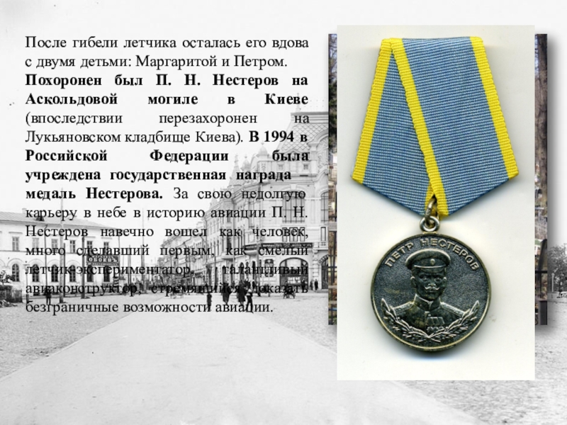 Похоронен был П. Н. Нестеров на Аскольдовой могиле в Киеве (впоследствии перезахоронен на Лукьяновском кладбище Киева). В 1994 в Российской Федерации была учреждена государственная награда – медаль Нестерова. За свою недолгую карьеру в небе в историю авиации П. Н. Нестеров навечно вошел как человек, много сделавший первым, как смелый летчик-экспериментатор, талантливый авиаконструктор, стремящийся доказать безграничные возможности авиации.