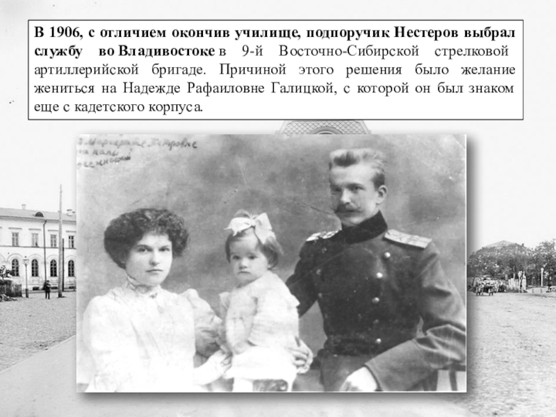 Слайд 33В 1906, с отличием окончив училище, подпоручик Нестеров выбрал службу во Владивостоке в