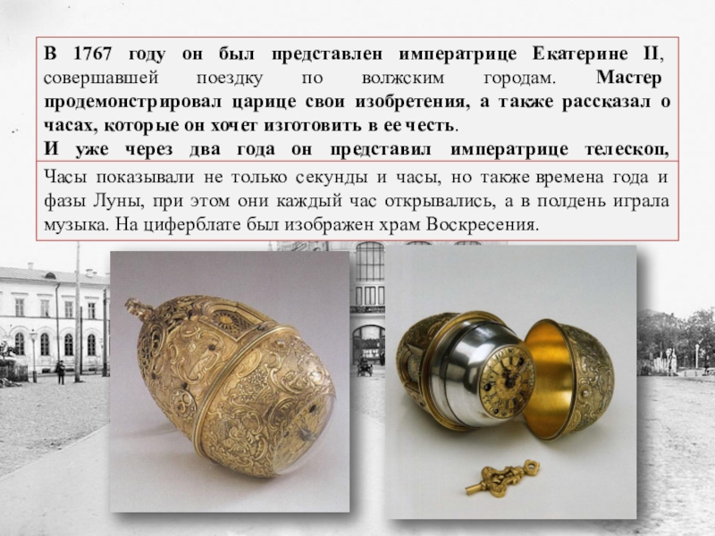по волжским городам. Мастер продемонстрировал царице свои изобретения, а также рассказал о часах, которые он хочет изготовить в ее честь.