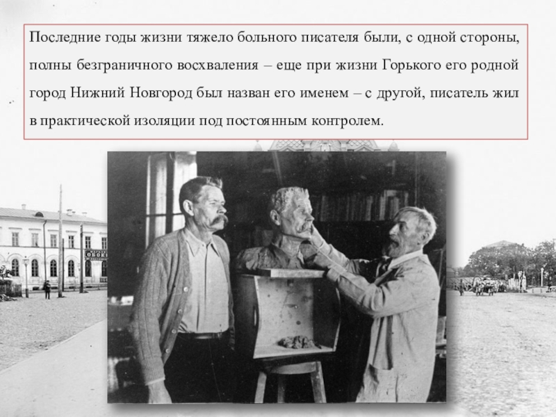 безграничного восхваления – еще при жизни Горького его родной город Нижний Новгород был назван его именем – с другой, писатель жил в практической изоляции под постоянным контролем.