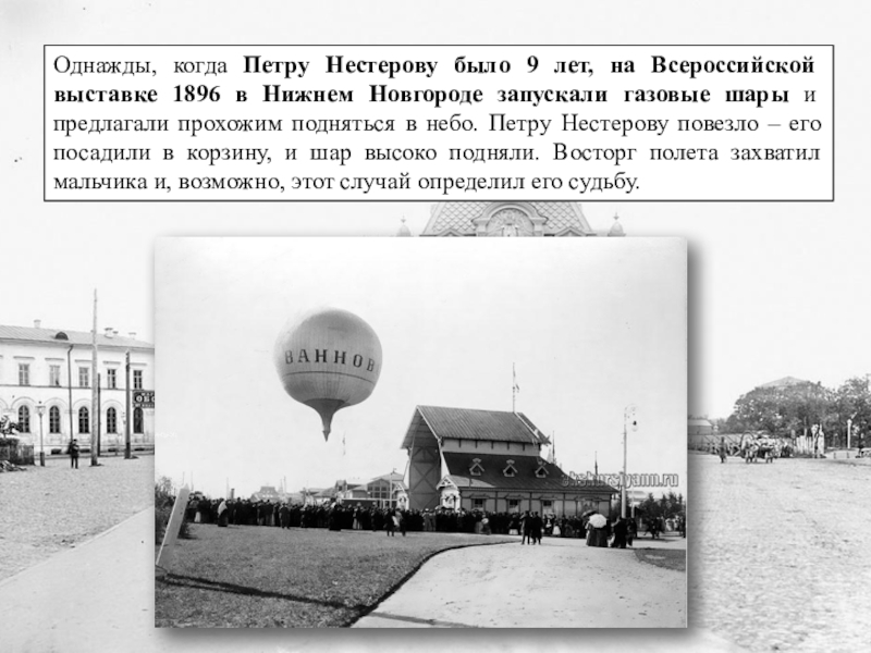 в Нижнем Новгороде запускали газовые шары и предлагали прохожим подняться в небо. Петру Нестерову повезло – его посадили в корзину, и шар высоко подняли. Восторг полета захватил мальчика и, возможно, этот случай определил его судьбу.
