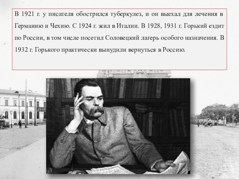 лечения в Германию и Чехию. С 1924 г. жил в Италии. В 1928, 1931 г. Горький ездит по России, в том числе посетил Соловецкий лагерь особого назначения. В 1932 г. Горького практически вынудили вернуться в Россию.