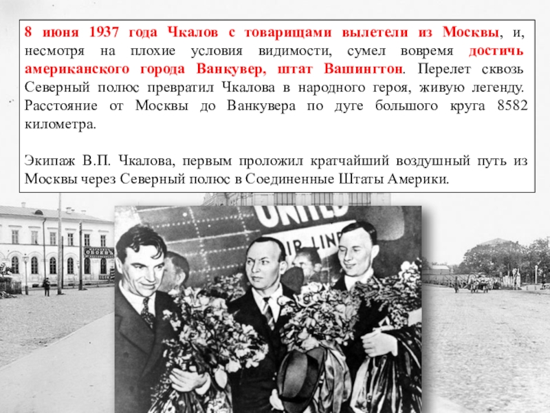 несмотря на плохие условия видимости, сумел вовремя достичь американского города Ванкувер, штат Вашингтон. Перелет сквозь Северный полюс превратил Чкалова в народного героя, живую легенду. Расстояние от Москвы до Ванкувера по дуге большого круга 8582 километра.
