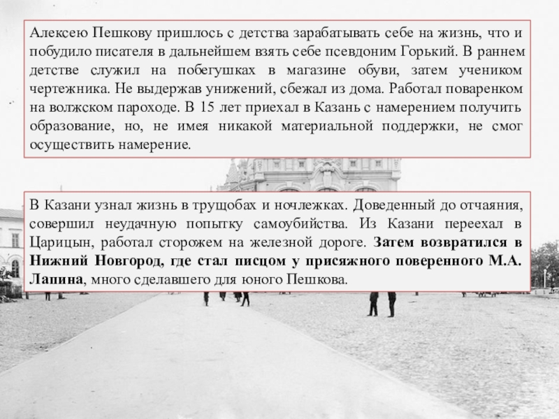 Слайд 18Алексею Пешкову пришлось с детства зарабатывать себе на жизнь, что и