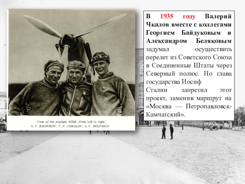 Слайд 48В 1935 году Валерий Чкалов вместе с коллегами Георгием Байдуковым и