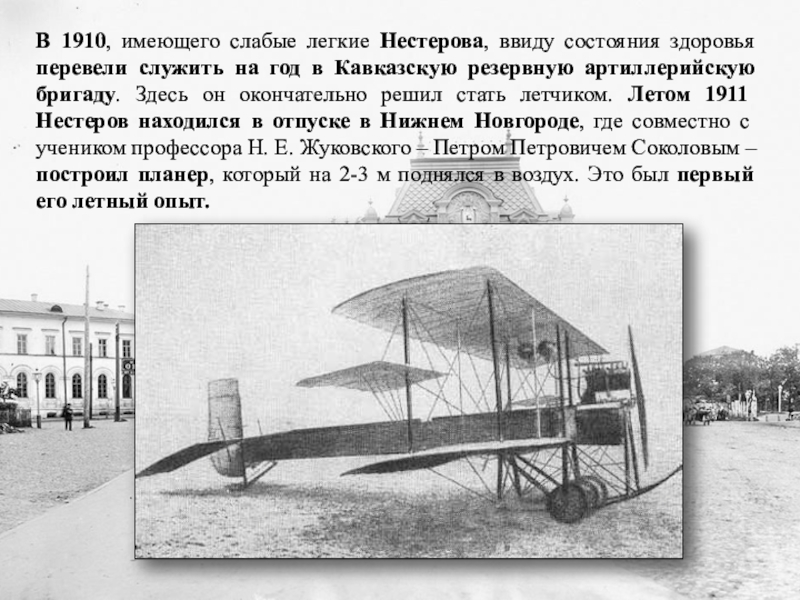 на год в Кавказскую резервную артиллерийскую бригаду. Здесь он окончательно решил стать летчиком. Летом 1911 Нестеров находился в отпуске в Нижнем Новгороде, где совместно с учеником профессора Н. Е. Жуковского – Петром Петровичем Соколовым – построил планер, который на 2-3 м поднялся в воздух. Это был первый его летный опыт.