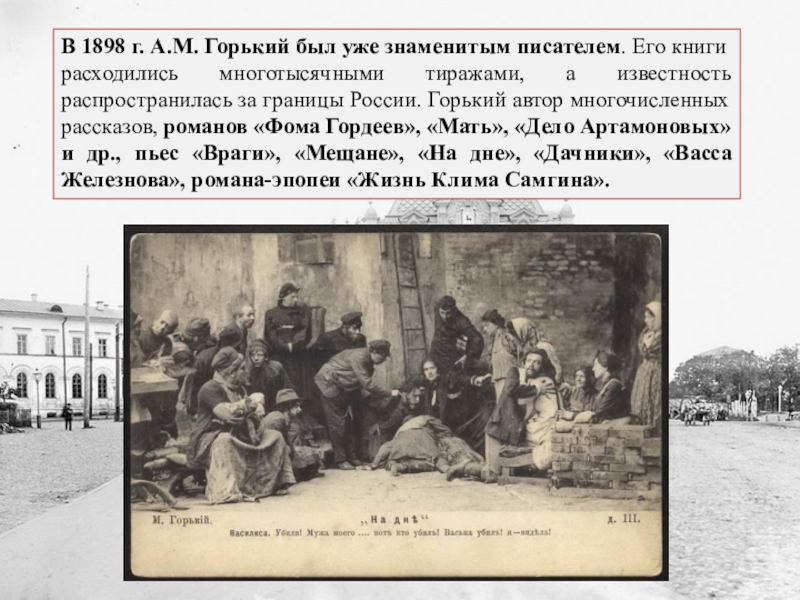 расходились многотысячными тиражами, а известность распространилась за границы России. Горький автор многочисленных рассказов, романов «Фома Гордеев», «Мать», «Дело Артамоновых» и др., пьес «Враги», «Мещане», «На дне», «Дачники», «Васса Железнова», романа-эпопеи «Жизнь Клима Самгина».