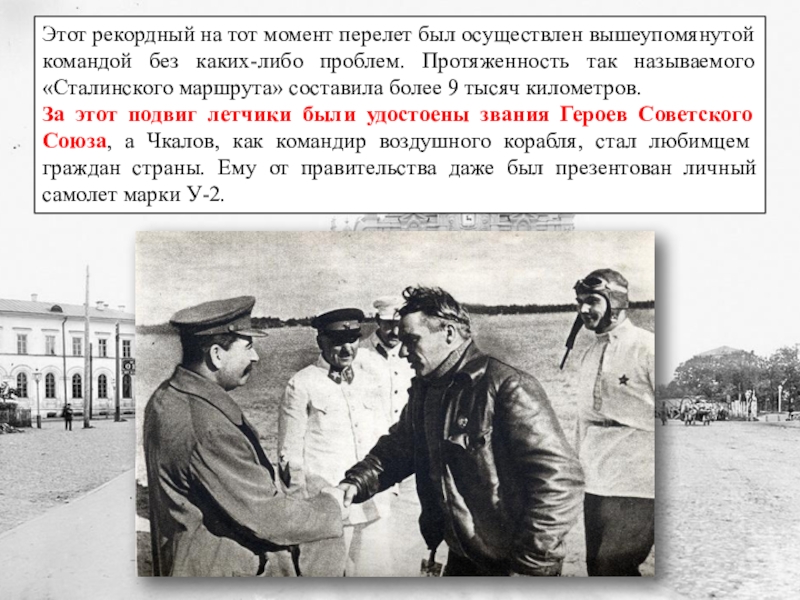За этот подвиг летчики были удостоены звания Героев Советского Союза, а Чкалов, как командир воздушного корабля, стал любимцем граждан страны. Ему от правительства даже был презентован личный самолет марки У-2.
