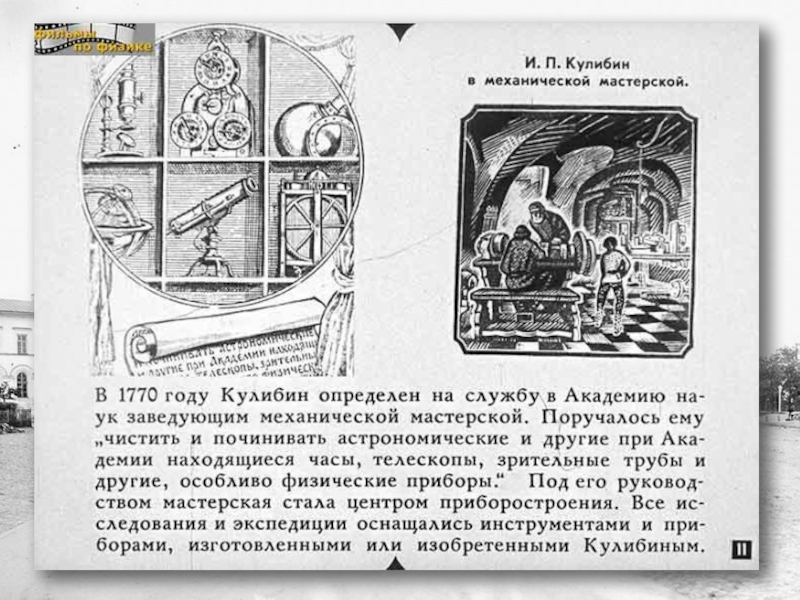 часовую мастерскую. Слава о чудесном мастере разнеслась по всему городу, после того как он починил «замысловатый снаряд, показывающий делянки суток» самого губернатора. После этого отбоя от клиентов у Кулибина не было.