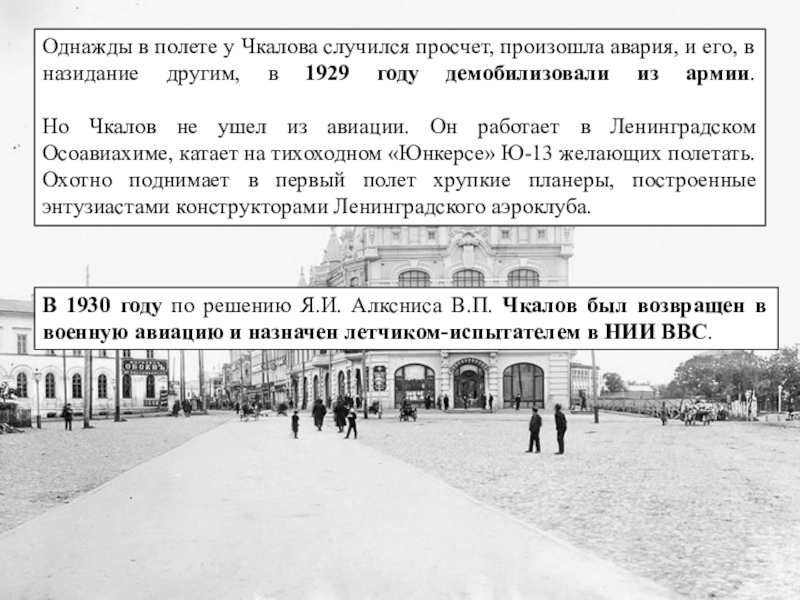 Но Чкалов не ушел из авиации. Он работает в Ленинградском Осоавиахиме, катает на тихоходном «Юнкерсе» Ю-13 желающих полетать. Охотно поднимает в первый полет хрупкие планеры, построенные энтузиастами конструкторами Ленинградского аэроклуба.