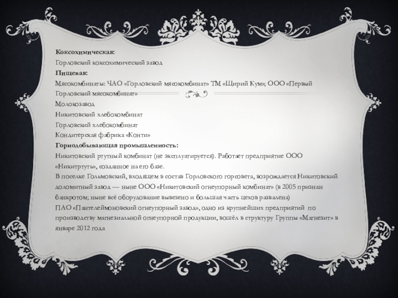 Мясокомбинаты: ЧАО «Горловский мясокомбинат» ТМ «Щирий Кум»; ООО «Первый
