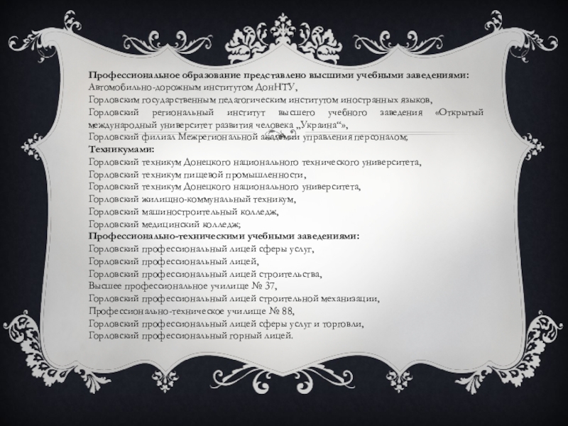 Слайд 10Профессиональное образование представлено высшими учебными заведениями: