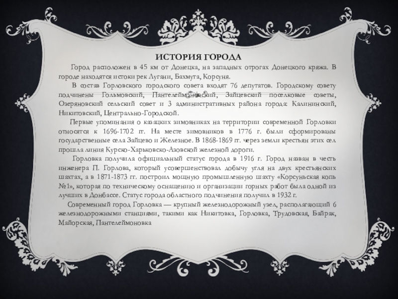 Горловка получила официальный статус города в 1916 г. Город назван в честь инженера П. Горлова, который усовершенствовал добычу угля на двух крестьянских шахтах, а в 1871-1873 гг. построил мощную промышленную шахту «Корсуньская копь №1», которая по техническому оснащению и организации горных работ была одной из лучших в Донбассе. Статус города областного подчинения получил в 1932 г.