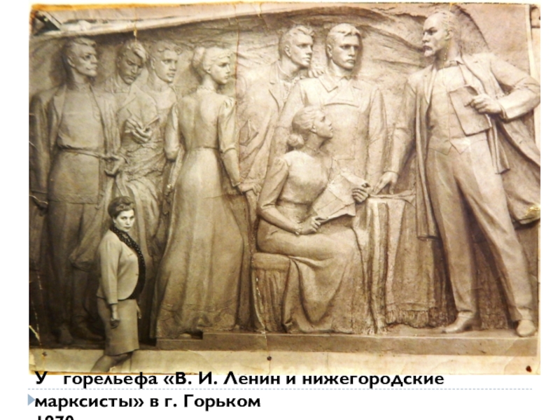 Слайд 10У горельефа «В. И. Ленин и нижегородские марксисты» в г.